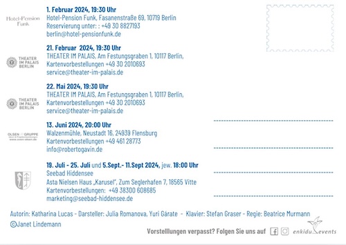 Der Kurbetrieb schrieb: Bereits zum zweiten Mal gastierte die Theaterproduktion „Asta!Asta!Asta!“ von „enkidu-events“ im Rahmen der Asta-Nielsen Tage bei uns auf der Insel Hiddensee. Das Open-Air-Theater-Event wurde von über 500 Zuschauern besucht und die Leistung der Schauspieler mit Standing Ovation gefeiert. Die theatrale „Karusel“ Fahrt durch das Leben der Stummfilmdiva zog das Publikum in den Bann.